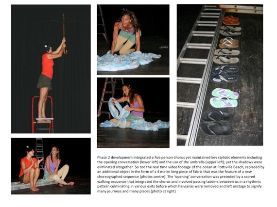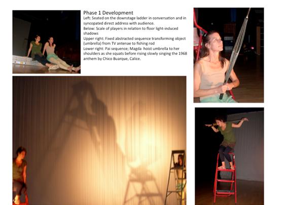 From the outset, the exploration of memory fragments of childhood places of refuge, made Train Tracks and Rooftops resonant with notions of identity, place, and belonging. After de Certeau, our stories; those narratives we construct about our lives, reveal that we are engaged in mapping and re-mapping our identities. Telling stories is a way we make meaning of our lives, of ourselves, of others, and of the world we live in. Contemporary autobiographical performance has emerged as a methodology of making or devising in which “the use of personal interests and narratives as source material leads to a complex creative process that reflects upon real life data to shape a performance piece.”4 In developing Train Tracks and Rooftops, we underwent three phases. The initial phase sought to liberate these places and our initial memories as performative. This phase drew on the established performativity of the two performers and could be said to have adopted Deidre Heddon's loose description of autobiographical performance, relying on the direct address mode in which performers engage immediately with audience members through performed storytelling. In this phase the style drew on narrative storytelling structures and fixed locations in the space: a roof top, the ocean, a wall on which we sat and recounted stories, and also narrated transitions in each others' solo sequences. Four ladders of vary sizes together with an umbrella were incorporated in a range of ways to support the work. In some respects we were performing two discrete solos simultaneously. The composite below, Figure 1, gives some insight into the simple design, demonstrating the way in which we sit to directly address the audience in the opening sequence, which occurred after a percussive music score made by slapping rubber thongs together.5 Then larger of the images in Figure 1 attempts to reveal the space and spatial relationship between the two principle ladders and the way lighting design was integrated to incorporate shadow work.