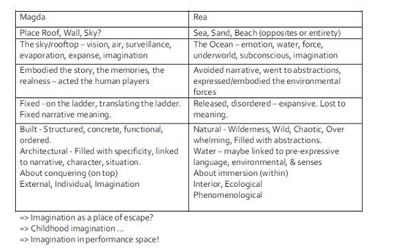 In some respects this phenomenological struggle we found ourselves in could be written off as a fairly rudimentary step in creative practice. John-Steiner reflects “marginality, estrangement, and self doubt frequently plague creative people.”18 John Freeman19 examines the phenomenon of dislocation in respect to performance as the place in which we encounter the acute sense of cultural displacement that is a common experience for people today. The making process appeared to have arrested the zone of safety that the ocean and rooftop had represented to the child-Rea and the child-Magda and we began to lose faith in the piece. In reflection, we found that the specifics of the narrative fragments guiding us had begun to appear in our reflective notes and discussions as the adjectives to describe our sense of failure and disconnection. For example I write: “we are all at sea;”20 drawing on the located centre of my narrative as a metaphor to explain my sense of dislocation. At around the same time Magda states: “It was then that encountered with a big new wall – Myself;”21 drawing on her locale as a synonym for being blocked or oppressed. In both utterances there is reference to the locations: the sea; the wall; as places of entrapment, or barriers to expressivity, rather that the constructs of freedom or liberty that the locations had represented to the child-Rea and the child-Magda in their memories. The process of devising had begun to undo the memories as discrete narratives and in so doing, unravel our identities as performers… it was as if the children were at risk of losing their pasts.
