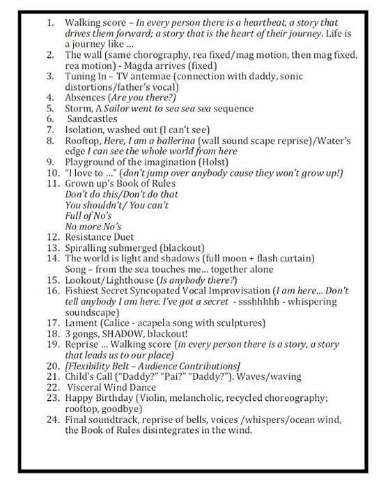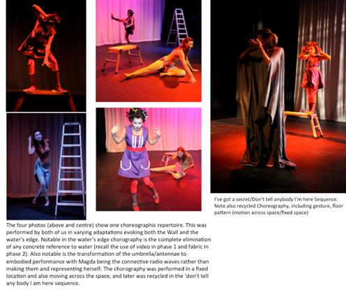 In the rehearsal that Magda is referring we were working on choreography linked to the ocean motif. We had discovered a range of elements and identified textures and shapes but were dissatisfied. There appeared to be no vitality in me. As director, Magda made suggestions and eventually shifted on stage working in duet with me, adopting antagonist positions within the scenarios, working to shift the energy (of me/the piece). A sequence developed around my vocal expression of the word ‘No;’ while the movement was confrontational and physical. In the moments of contact and space between the two bodies I felt other memories from that period, nothing tangible - visual or narrative; it was more in terms of attitudes and in some cases, sensations. More obvious was my awareness of a deep resistance to continuing with the sequence, mirroring the ‘No’ text that I had been reciting. The simultaneous landscapes of the piece we were making and the process we were undertaking converged for me in a way that I was unable to understand. Later in reflection I wrote: “Working up to the ‘No’ sequence, I can really see three discretely different fights in me.”