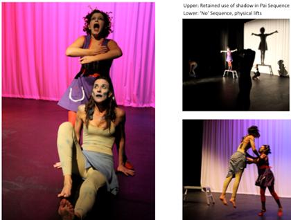 At this point it felt as though we had arrived somewhere. The conceptual terrain of imagination opened a rich area of content to explore and compelled the making process forward. Perhaps it is not surprising at all that we arrived here. UK contemporary performer, Alexander Kelly speaks about the process of making autobiographical performance, as beyond cognitive understanding much of the time. It “strays into the grey area between … memory and imagination.”26 David Williams suggests that “there are multiple strata and stages of dramaturgical work in devising contexts.”27 Through this phase, a critical shift in our perspective saw rapidly redraft the rehearsal room critique from a social to aesthetic reading. Key elements of the earlier versions of the piece were transformed and vibrant visual piece emerged based on a vocabulary of shape, rhythm, colour, gesture and image. See Figures 4 and 5 for some indication.